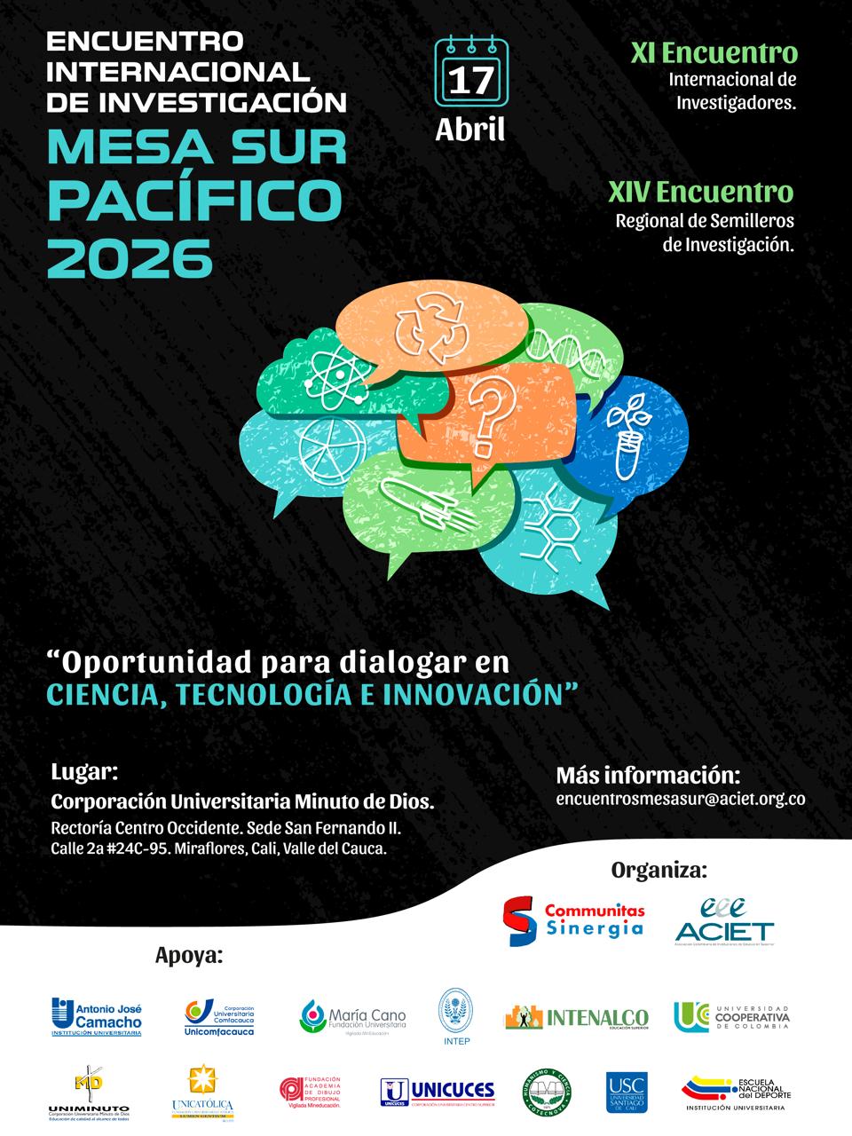 Desde ACIET tenemos el gusto de invitarle a participar en el Encuentro Internacional de Investigación Mesa Sur Pacífico 2026, un espacio académico diseñado para el diálogo, la socialización de experiencias y el fortalecimiento de la Ciencia, la Tecnología y la Innovación.